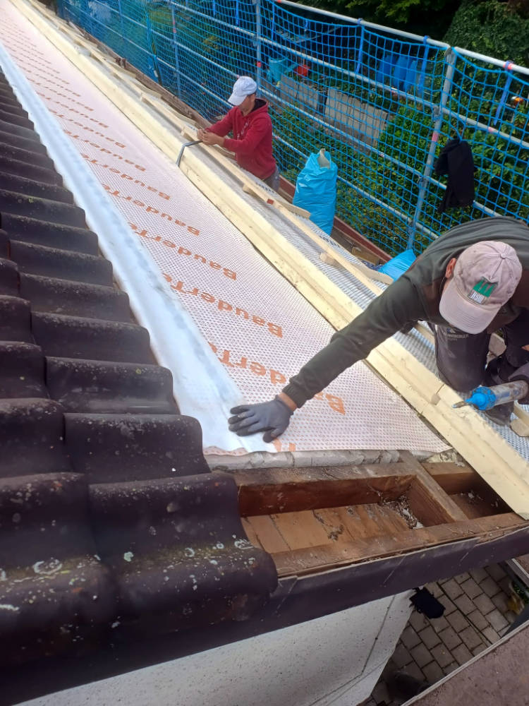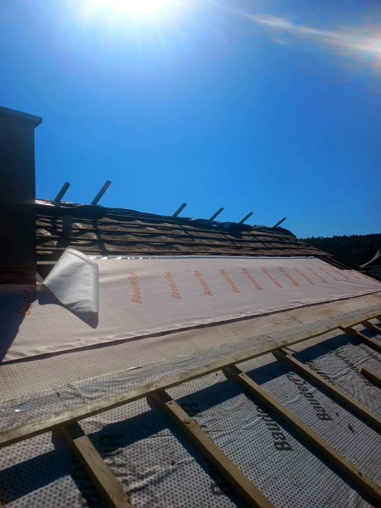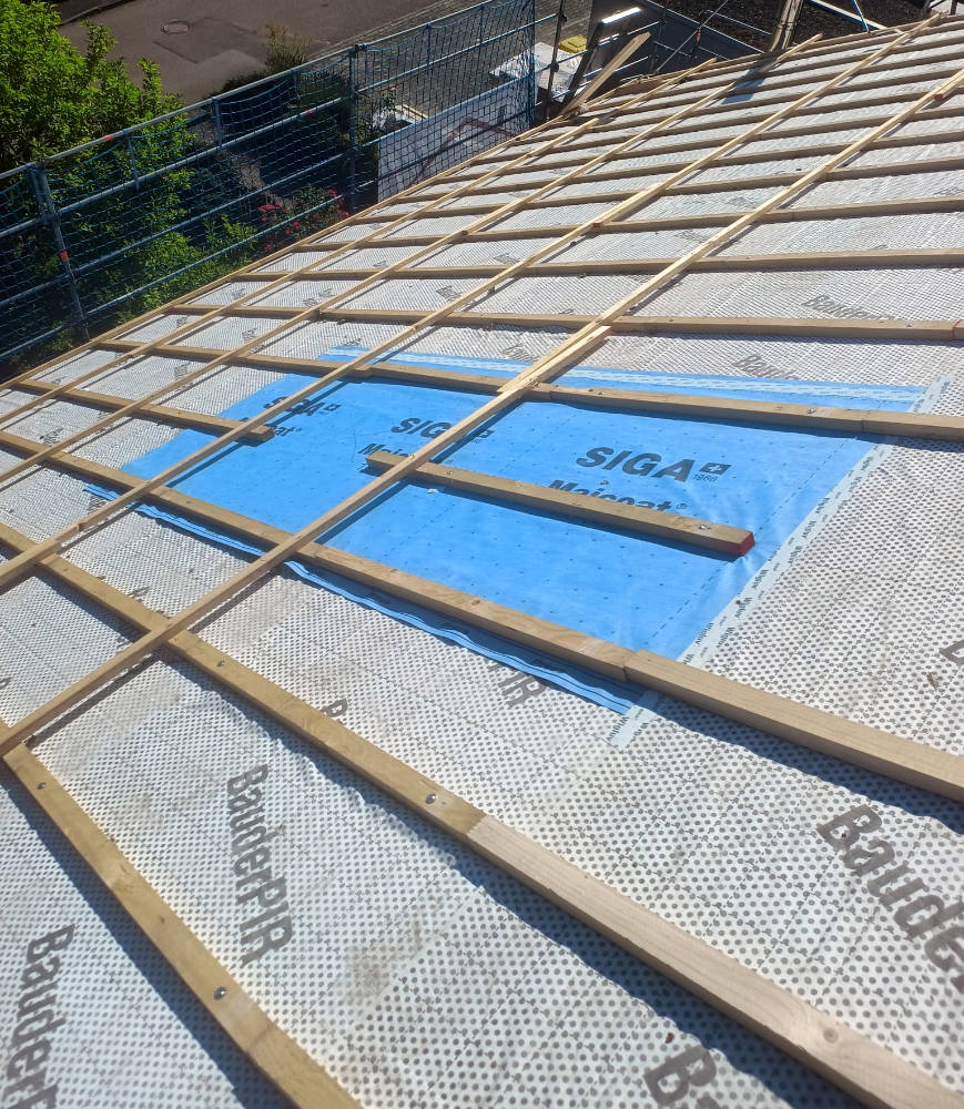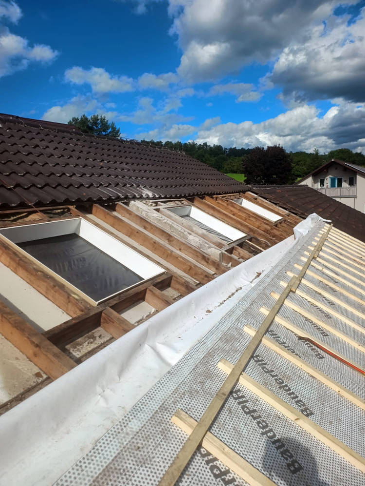 Zuerst wurden die alten Ziegel abgedeckt und die vorhandenen Dachlatten sowie die alte Folie entfernt. Anschließend haben wir eine BauderTex Dampfbremse direkt auf den Sparren verlegt. Sie sorgt dafür, dass Feuchtigkeit zuverlässig abgehalten wird und die Dachkonstruktion dauerhaft geschützt bleibt.