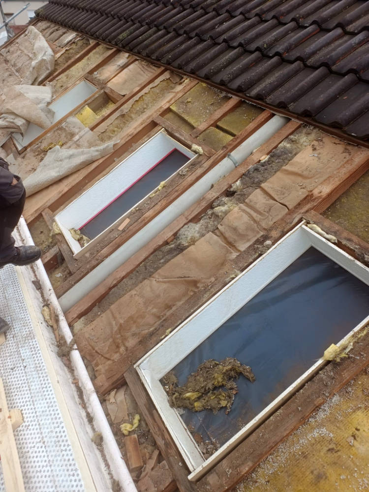 Ein weiterer wichtiger Arbeitsschritt war der Austausch der alten Dachfenster. Die neuen Fenster sorgen nicht nur für mehr Helligkeit und ein modernes Erscheinungsbild, sondern bieten auch eine deutlich bessere Wärmedämmung. Um den Anschluss der Fenster sauber und zuverlässig auszuführen, haben wir oberhalb zusätzlich eine Unterspannbahn (blaue Folie) eingelegt.