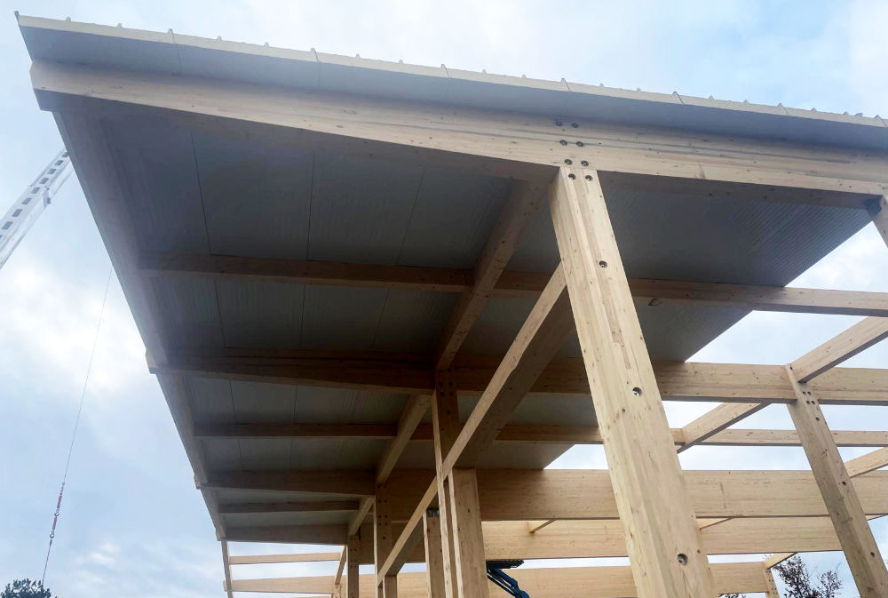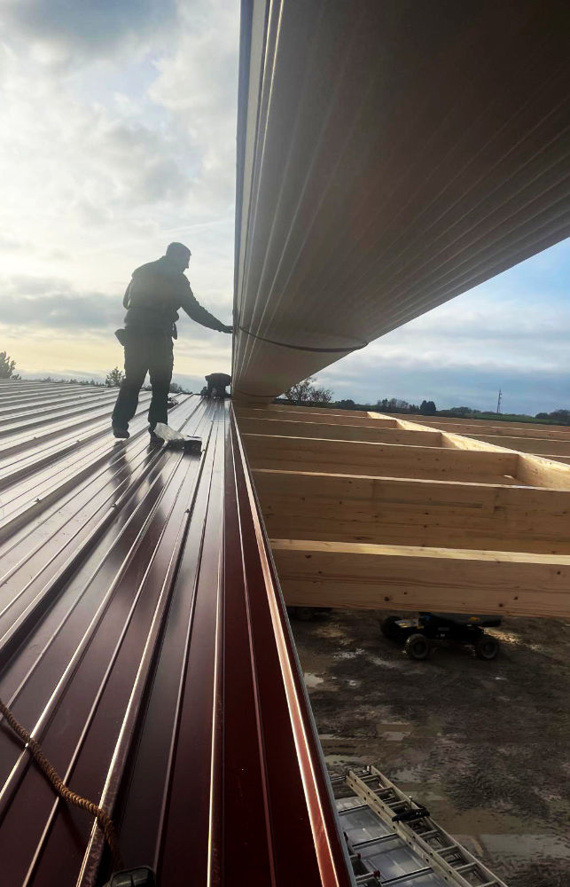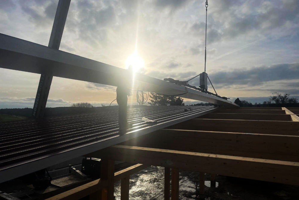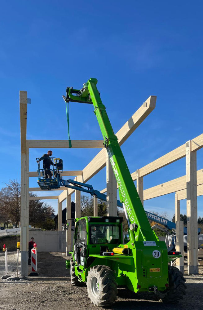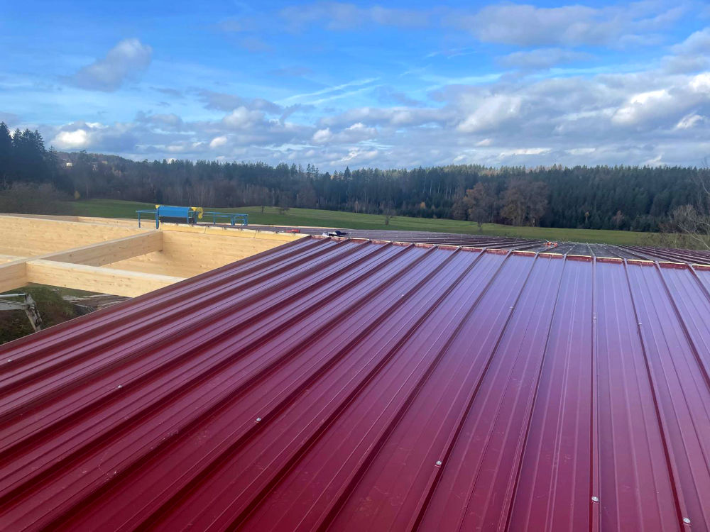Unsere neue Halle entstand als Kombination aus Holz- und Stahlkonstruktion mit sogenannten eingespannten Stützen. Diese Bauweise macht eine zusätzliche vertikale Aussteifung überflüssig und sorgt trotzdem für hohe Stabilität. Die Halle ist „über den Giebel“ gebaut – das heißt, der Giebel liegt an der langen Seite. So erreichen wir eine bessere Südausrichtung für unsere zukünftige PV-Anlage und vermeiden, dass die Traufen direkt an den Toreinfahrten liegen.