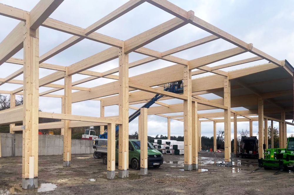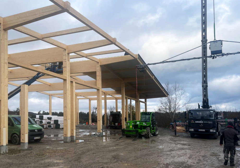 Die Halle misst 18 x 36 Meter und wird später unsere Produktions- und Lagerhalle beherbergen – inklusive Büro- und Sozialräumen. Die Beton- und Fundamentarbeiten haben aufgrund des schlechten Wetters rund vier Wochen gedauert. Der Aufbau der Holzkonstruktion selbst war dann überraschend schnell erledigt: Nach neun Arbeitstagen stand das Grundgerüst. Hier geht’s zum Richtfest.